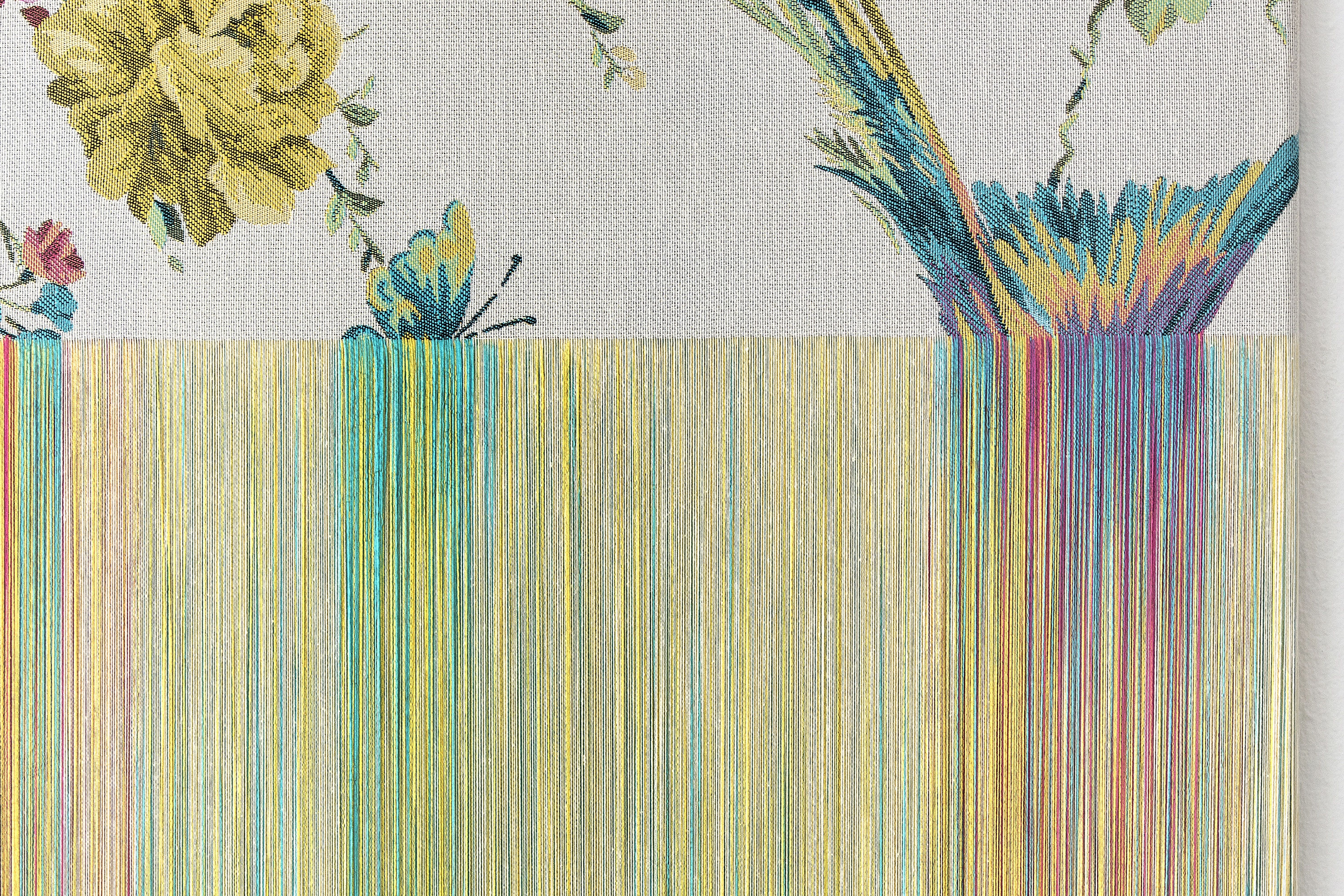 Vintage kimono silk and Japanese linen kusakizome kazuri backed with canvas. One round area stuffed with cotton batting, thread, tassel, dowels and wooden curtain rod.