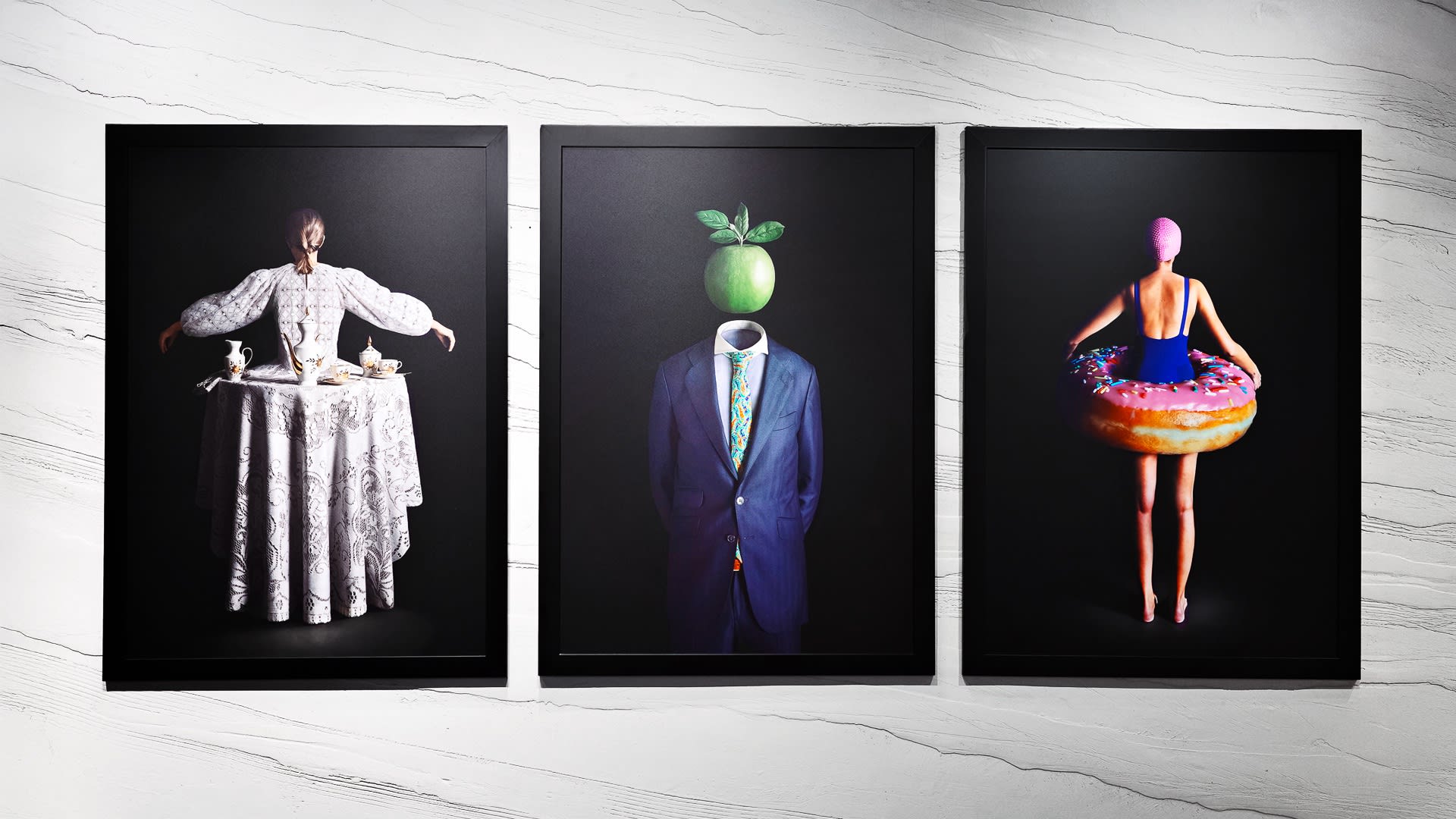 Miguel Vallinas is a contemporary digital photographer who explores surrealism and historical references in his work. His signature style isolates his subjects in a black void, creating a striking contrast with their bold colors and the depth of the background.